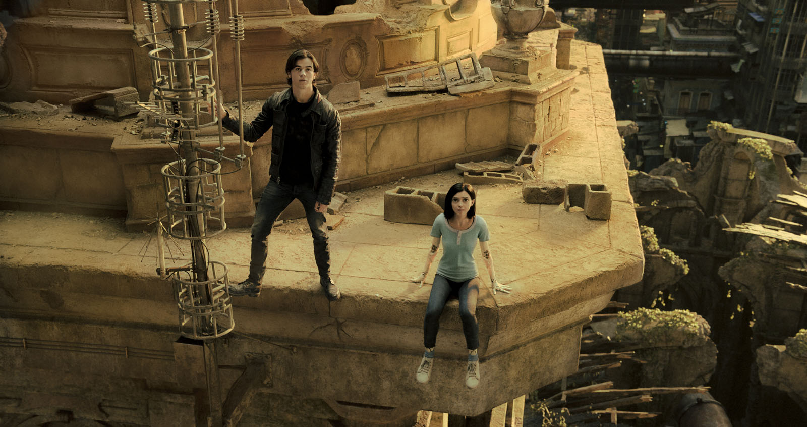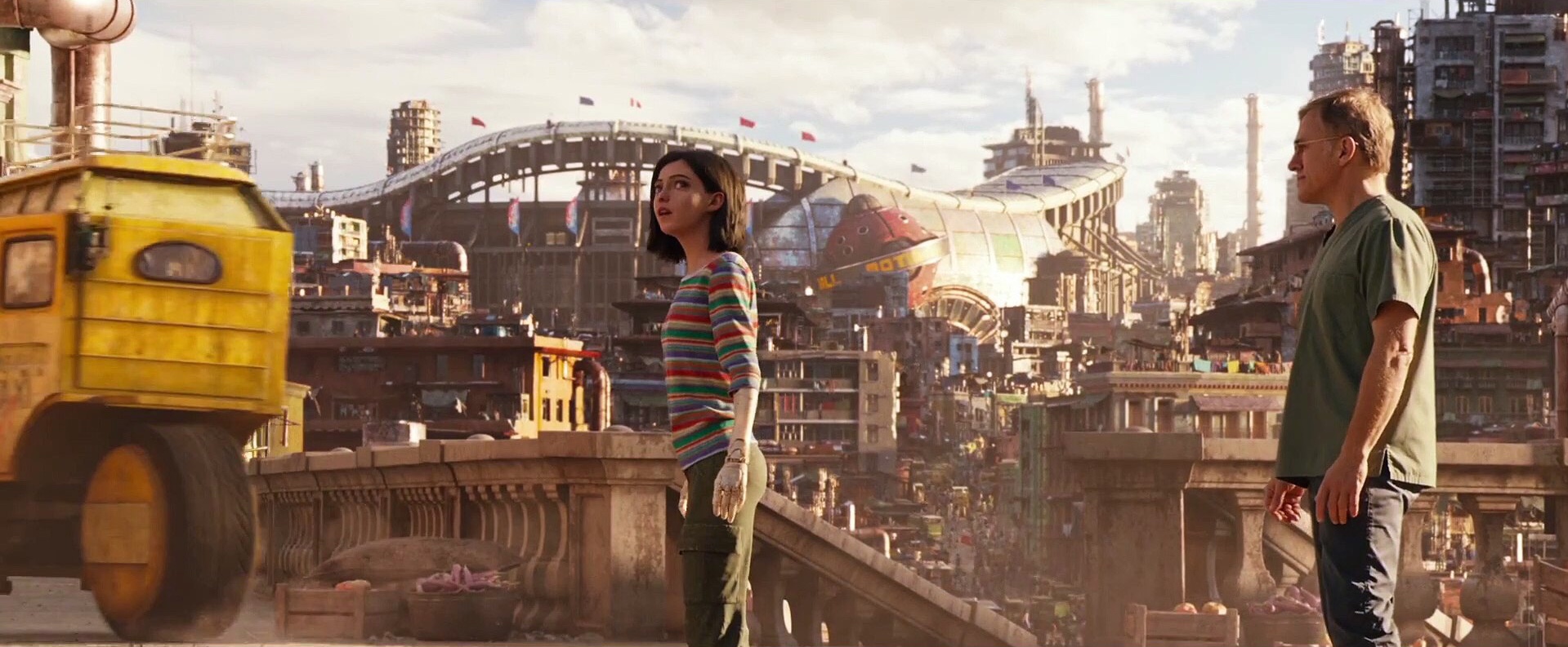In fact, the biggest part of the fun in Alita is trying to unpick what is Cameron and what is Rodriguez. Cameron certainly brings a sense of wonder owned by him and Spielberg almost exclusively. Alita waking in her new body and wandering Iron City have a relaxed patience lost on most modern filmmakers. Yet you’ve seen these time out moments of amazement and fascination (mirroring the audience) in The Abyss or Titanic or even Avatar. Cameron’s raison d’être is taking his audience and protagonists to rich, new worlds and allowing these strange environments to evolve the characters into new self-determined others. Rodriguez adds the detailing. He might not have been allowed the production scale needed without Cameron’s oversight, so he works diligently colouring in the gaps. The crowds feel like the extras from a Rodriquez flick… X 10000. The costumes, foods and colours of this world belong to the maker of Desperado, From Dusk Til Dawn and Spy Kids. Cameron has never seen a moment he didn’t want to maxisize (admirable) but Rodriguez manages to make the limited courtyard street game and alleyway fights just as kinetic as the grander set pieces later. Neither are creatives bothered about subtlety of dialogue or difficult grey area characters. Their styles and sensibilities chime together nicely.