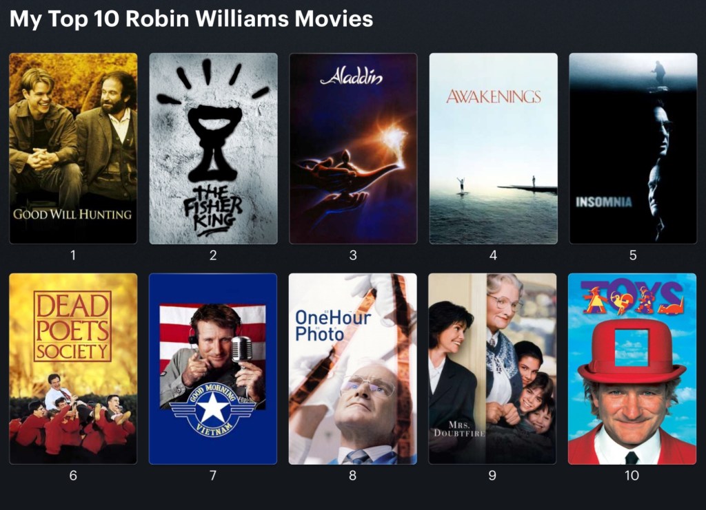1. Back to the Future (1985) 2. Stand By Me (1986) 3. The Jungle Book (2016) 4. Back To The Future Part 2 (1989) 5. The Wizard of Oz (1939) 6. Moonrise Kingdom (2012)