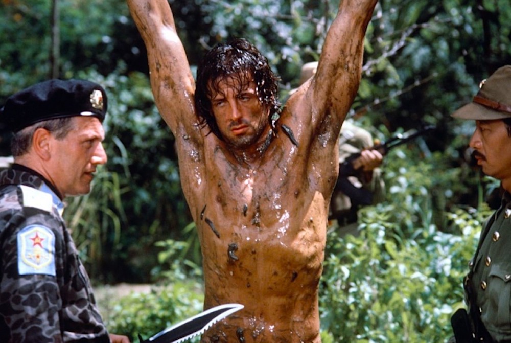 First Blood was never made with mega budget sequels in mind. But then Rambo started getting assigned missions. Started trotting the globe. Now, instead of stabbing young David Carusos in the ass and telling them to go home before they killed, he was mowing down hundreds of faceless exotic commies with AK-47s, land mines, M68 Fragmentation Grenades, mini-guns that shoots a 7.62 round at 3600 rounds a minute, explosive arrows, a bazooka AND his trademark knife. He is not at risk during these bulk executions. Only when captured does Rambo 2.0 become skin surface vulnerable. He is tortured. Like an impervious Jesus Christ on the cross. America’s sins are his to be endured for, Johnny Foreigners despotic politics are his to absorb and shield us from. You wanna queue for bread or watch Sly cauterise hit bullet holes with a burning stick and gunpowder? This is slick poster boy patriotism as a gung-ho capitalist passion play.