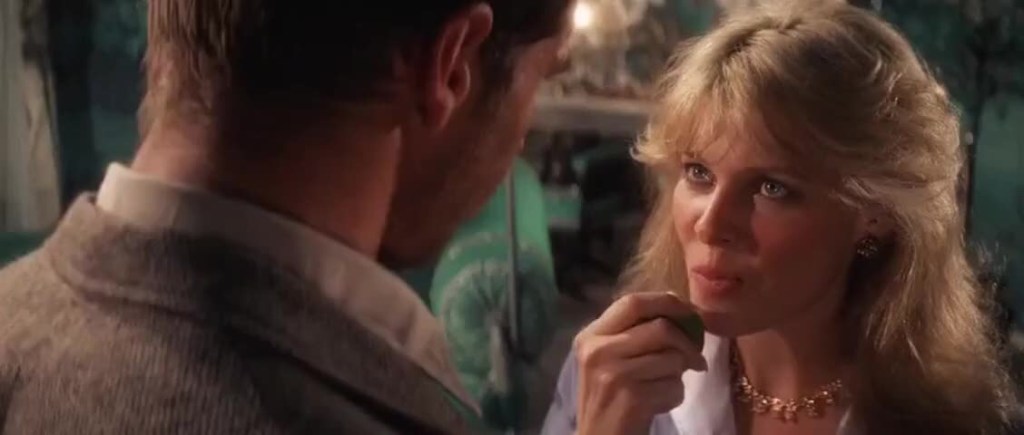 Favourite Bit: I’m going to start this by saying I’m a Marion Ravenwood Guy all the way. I need a woman who can drink me under the table and knock a mercenary out with a frying pan. Kate Capshaw’s Willie Scott is whiny, screechy and causes more problems than she avoids. As a running joke she’s a sexist caricature, a dumb blonde joke. A consistent joke however, that absolutely kills. Indy has it hard enough this adventure what with being poisoned, brainwashed and having the soles of his feet burned off by a runaway mining cart. It is hilarious that the showbiz princess he allows “to tag along” throws away his gun minutes after the front credits roll and gives away their position with every scream. The Five Minutes To Love sequence is so funny. Indy and Willie flirt, then their hubris gets in the way. Even though they both wanna get their fuck on, they argue their way out of a night of passion. The foreplay as argument has the same witty back-and-forth as a screwball romance. Hepburn V Tracy. Bogart V Bacall. Feel the heat and the wit. Willie gives Jones 5 minutes to give up and get in. And then they wait each other out. How frustratedly they wait… Just as times up and he might give in… an assassin appears. Indy is fighting for his life while Willie nags him through the door. “I could’ve been your greatest adventure!” Well Willie, probably not… but it is a tremendously playful, funny, silly highlight. Temple of a Doom is a scrappier film, not as solidly constructed as Raiders but it has more room for crowd pleasing daftness like this sequence or the Busby Berkley credits or the grotesque Pankot Palace banquet. I really appreciate these risky lurches into lunacy, no matter how distasteful and sexist. “You call him, Doctor Jones! DOLL!”