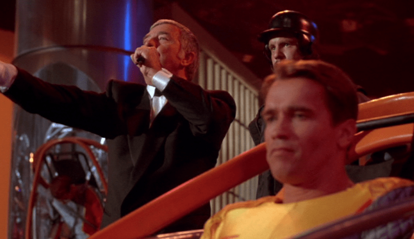 It is a perfect pre-teen hyper violent illicit actioner. Our innocent but deadly “Butcher of Bakersfield” faces off against a series of flamboyant action figures. One is a Japanese hockey player with exploding pucks and a razorsharp stick. An overweight opera singer who shoots lasers from a suit made of fairy lights. A hillbilly biker with a chainsaw the length of a pool table. Jim Brown with a jet pack, flamethrower and Mister Fantastic’s hair Afro-style. And Jesse Ventura. An 18 certificate movie seemingly targeted at people who can’t even shave yet. The kills are silly. Every moment of violence a set-up for Arnold to deliver a pithy punchline. “Hey! Lighthead! Hey Christmas Tree!!” “Here’s your Subzero, now plain zero.” “Well, I haven’t been in show business as long as you have, Killian. But I’m a quick learner. So, I’m going to give the audience what I think they want.” He fucking does as well.