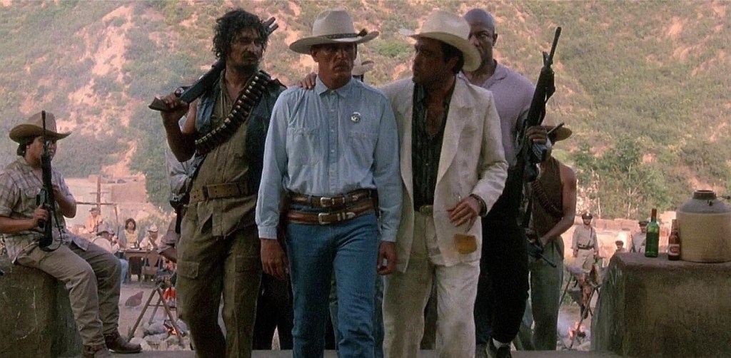 Also starring: María Conchita Alonso! Rip Torn! William Forsythe! AND Clancy MUTHAFUCKIN’ Brown! Holy shit… this must be the greatest movie none of us have ever seen. And you know what? Extreme Prejudice is pretty, pretty, pretty good. A modern day western. That favourite sub-genre of mine. With a Ry Cooder twangy guitar score to boot. Nolte’s white hat is a bit of a hulk… his only personality quirk is he doesn’t like people joining him for a drink uninvited. Powers Booth channels his inner Cy Tolliver and plays the vainglorious cartel boss with a cocky sadness. He’s the best thing in this and chews up some awesome lines. Ironside runs a secret special ops unit of “officially dead” soldiers… this is where your Forsythes and Clancys come in. A lot of screentime is spent on them… you get the best action sequence with the zombie squad as they stage a robbery to match Point Break’s immersive heists… but they really deserve their own movie. They distract from the purer western duel between the leads. What they do add is extra guns to the grand finale. Hill (always comfortable with an action ensemble) replays The Wild Bunch massacre with automatic weapons and rather callously kills off most of the cast with same disregard as if they were extras. There’s something true about not giving each of them an extended death scene but by the credits you can’t help but wonder whether even more could have made out of all the potential that the hook, the movie poster and the cool trailer have!? Strange to watch a movie that hits the spot, exceeds expectations yet leaves you begging.