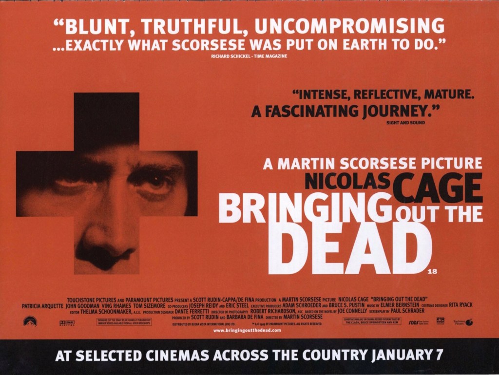 A swan song. The very last time Scorsese worked on this kinda claustrophobic urban character study scale. Everything over the last twenty years has been pointedly epic and sprawling. I guess The Departed and The Wolf of Wall Street have the same satirical black heart. And Shutter Island is as self contained and geographically limited – but the intention there is very much grander and more baroque. Bringing Out The Dead feels like the last gasp of young punkish Marty who trapped us in his city, his religion, his paranoia, his addictions, his night. No one else harnesses the night like Scorsese – the moon under water becomes the neon lost in a dirty puddle. Mean Streets. Taxi Driver. After Hours. A character study, a working grind, an existential hell. I wonder if he and Paul Schrader ever have a light conversation? Make small talk?