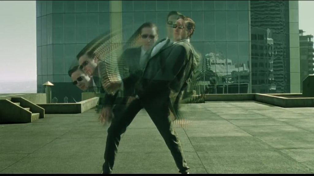 There is stuff I like. The stunts have an epic scale to them. The ‘breaking free of Morpheus’ sequence that leaps from helicopters to rooftops and back again works for me as pure action popcorn whatever the context. I’m never going to get bored of seeing the quiver of joy on Keanu’s face as he shows off his kung-fu posturings. Carrie Anne-Moss looks glorious in leather. Joey Pants has a few nice scenes as the treacherous Cypher. Hugo Weaving as Agent Smith is a fascinating villain who belongs to a far better franchise in my opinion. When we go down the rabbit hole and take the red pill, the cyberpunk nightmare of reality is horrific and well realised. It is such a shocking vision of the future yet it makes a decent amount of narrative sense.
