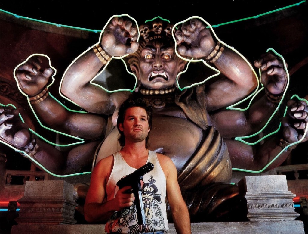 And without getting too deep into “The Hell Of The Woke ReAppraisal” there’s sort of a point to all the orientalism which the short sighted find offensive. The Chinese-Americans in the movie live in a world (and an underworld) marinated in lore, tradition, culture and mythology. The three prominent white Americans are the outsiders, the other, pointedly lacking a developed culture. Kurt Russell’s Jack Burton is without mythology. Sure he talks “American” but his Japanese logo vest, his Spanish cavalry boots and Peruvian sweatshirt all suggest a soul without bearings. His background is pic’n’mix. The anti-union, anti-marriage, anti-corporation swagger he projects as a philosophy is resistant of what few traditions WASP Americans have. He’s a cowboy without a horse, a warrior without a war, a coward without a fight or flight impulse, a heterosexual who avoids the company of women and a pioneer who has reached the ends of the Earth… California…. There’s no more West left. We all know the first draft of the script was set in the Wild West.