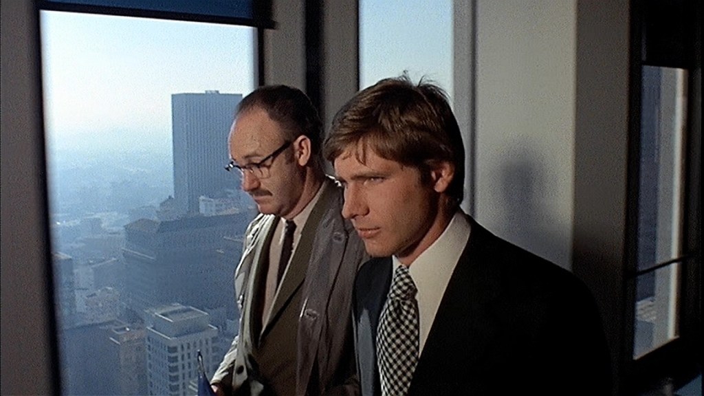 Hackman’s Harry Caul turns 44 the day we meet him. Exactly the same age as me watching this for the fifth or so time. The usually masculine, twinkling character actor who became a sure thing lead in the late 20th century here downplays all his bullish charisma and becomes a background man. His raincoat is weakly transparent, his voice a whisper, even the business circles he is an infamous star within don’t recognise him on first meetings. He is a man full of guilt, a man who wouldn’t know what a decisive action is, he has closed himself off from the world and his ultimate realisation of his role within that world leaves him with nowhere to hide. A baby sucking on a brass dummy. The cast is uniformly fantastic. Teri Garr’s sad girl in waiting, Cazale’s sad protege and Allen Garfield’s sad, jealous and destructively competitive competitor. Ford is low down in the credits but has, to my mind, the third biggest role. The slightly camp, preppy assistant to a very powerful man. It is a proper acting turn with a few small but telling choices. Interesting to note that Ford, once he became the biggest name in the movie stratosphere, adopted a persona much similar to Hackman’s default settings in big budget entertainments. Confident, somewhat grumpy and smartly invincible. Neither of them play into that powerful type here.